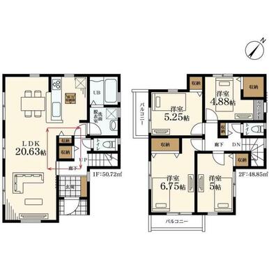 | 間取り(内訳) | 4LDK(洋6.7/5.2/5/4.8LDK20.6) | 建物面積 | 99.57㎡ |